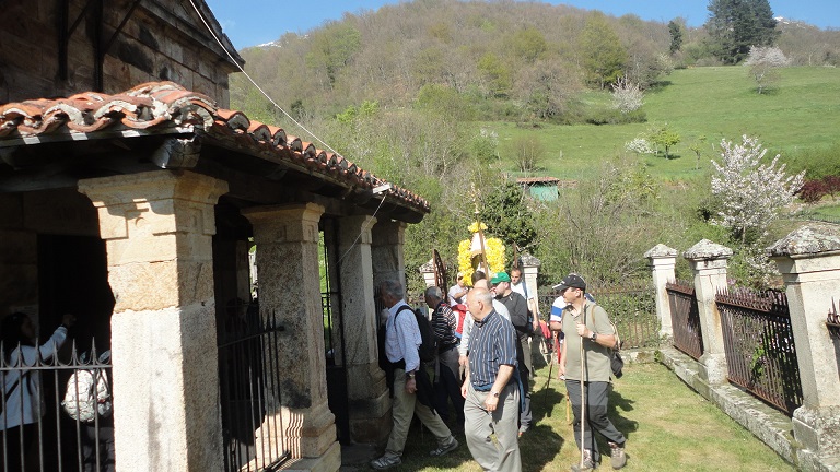 PROCESIÓN DE BAJADA DE LA VIRGEN DE LA LUZ A SOMANIEZO. Tras un verano excepcional en que la imagen de la Virgen de la Luz pasó el verano en Aniezo, y tras su vuelta al Santuario de Peña Sagra, el otoñoy el invierno se han hecho largos, pero el 24 de abril retornamos a buscar a Nuestra Patrona a su remozado Santuario, que luce en un magnífico estado, compitiendo con la belleza de un magnífico día, y con la imagen de la Virgen, como siempre acompañada de los narcisos amarillos. En la eucaristía celebrada a la una, El Evangelio relata las Bodas de Caná. Don Elías nuevamente envió el mensaje de que debemos llevar a la Virgen María en el corazón. Una Virgen María que es un espejo de las virtudes de su Hijo y que hace de mediadora ante Él. En las bodas de Caná María dice "haced lo que Él os diga", y así se resuelve el problema de la falta de vino. A las cuatro se inicia la procesión, con un buen grupo de fieles, que deseamos ser dignos de llevar a la Virgen María en el corazón, para que ella lleve nuestras inquietudes a Dios. Los fieles se van turnando en llevar las andas, mientras se canta el Rosario dirigido por Don Elías, Juan y Francisco, pendientes de las andas . Se realizan las paradas del llano, de la cabaña de la cajiga, entrada del puerto, y la parada para recordar a Lorenzo y todos los difuntos. Don Benito realiza unas oraciones por ellos, realizando un gran esfuerzo para realizar todo el camino Después de este lugar nos acercamos al pueblo de Somaniezo, con menos pendiente en el camino, para llegar a la ermita de este pueblo. En la ermita esperan, más peregrinos que vienen a encontrarse con la Patrona de Liébana. Con la Salve y la veneración de la imagen de la Virgen, terminó otro radiante día en honor a "La Santuca". Don Elías anuncia previamente el calendario de celebraciones de "La Santuca" hasta su vuelta a Peña Sagra el 4 de mayo |